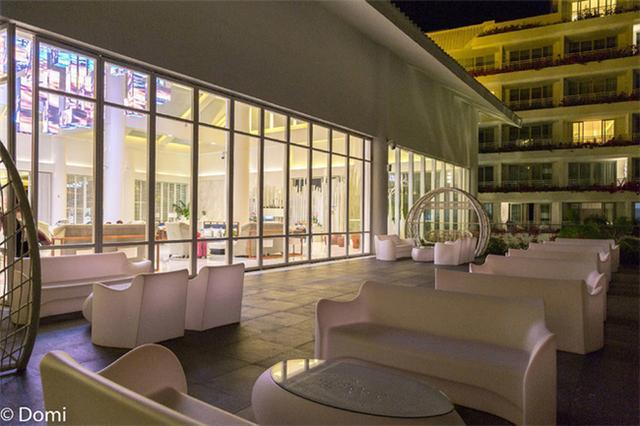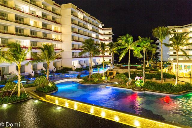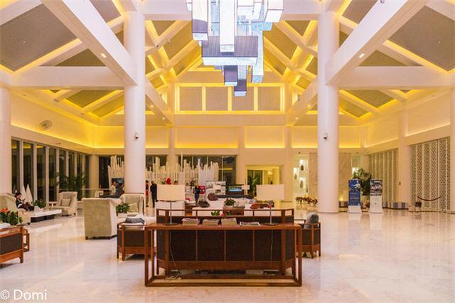 除了眼前的气派酒店,还有西式的餐厅,巨大的游泳池以及专属的海滩。宽敞明亮的大堂,国内最大的立体动态环绕LED灯阵轮回绚烂着色彩。