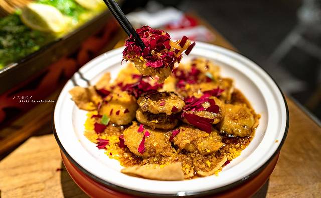 超级推荐的一道菜,外焦里嫩的藕盒带有淡淡的玫瑰香,这是一道需要自己动手的一道美味佳肴,藕盒上来的时候带着一支新鲜干玫瑰,需要自己把干玫瑰拍碎洒在藕盒上面,宛若仙女散花,一道颜值与美味并存的美味佳肴,入口更是令人唇齿留香。