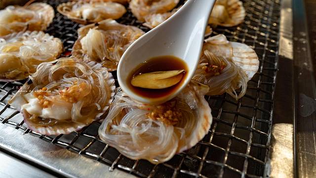 这里除了生蚝,扇贝和虾类也是不容错过的,还有各个种类新鲜的鱼类也是首选,扇贝的烤法基本和生蚝一致,扇贝上放上蒜蓉酱,放置烧烤盘上即可,自己烤出来的海鲜可以与海鲜店的味道相媲美,甚至可以说不是不相上下,个人比较喜欢自己烤出来的味道,因为可根据的自己的咸淡口味,随意添加蘸料。