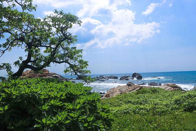 站在沙滩上放眼远望,海天一色,波涛浩渺,海岸边,巨石突兀,礁石经千百年洗刷,圆滑而光洁,难道这就是梦想中的神画吗?不对,这是景区中众多礁石中的一个,但将其取景入像,却与海、天、椰树、沙滩浑然一体,巧夺天工,不论如何取景,都是一幅美丽的热带风情画卷。