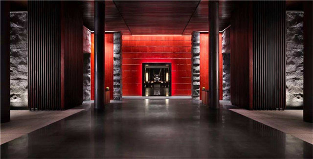 酒店的大门设计独特精致,由古典的上海石砖红瓦营造的时代感跃然心生,入目所及是排在长长走道两旁的深红色牛皮长椅,优美典雅。