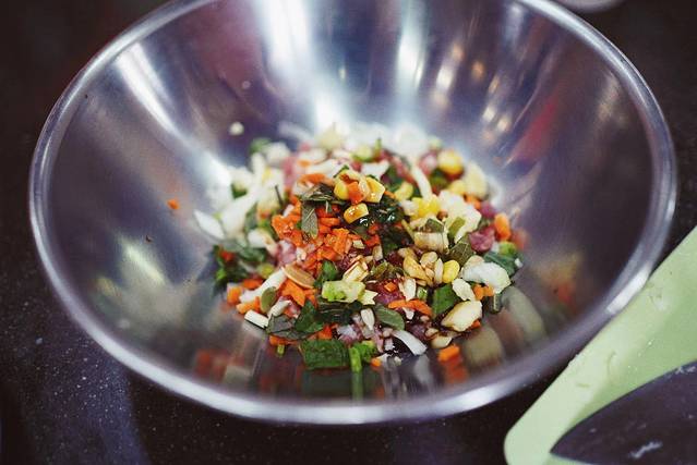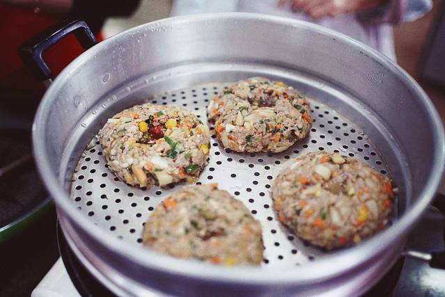 牛肉饼看似简单,但制作起来却十分讲究。首先要准备好各种蔬菜,切碎备用,牛肉泥中可以根据口味不同,放入芝士、辣椒以及各种喜欢的蔬菜末,浇上酱汁,但最重要的是,在捏成饼状的过程中,需要捏30下,如果捏不均匀,牛肉饼很容易在之后的料理过程中散开,而且影响口感。在下锅蒸之前,要在牛肉饼上搓一个小洞,这个洞可以说是美味的关键了,在蒸牛肉饼的过程中,你会发现,这个小洞会逐渐聚集一些汁水,是原汁原味的精华,所以在取出蒸好的牛肉饼做二次加工时,一定要注意避免汁水流失,放在不粘锅上二次加工时,可以直接用这个汁水进行加工,保留牛肉饼最鲜美自然的滋味。