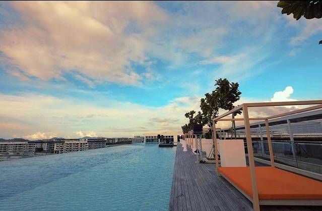 这个公寓楼下有吃的,楼顶有游泳健身的,在楼顶看个落日也是超正。