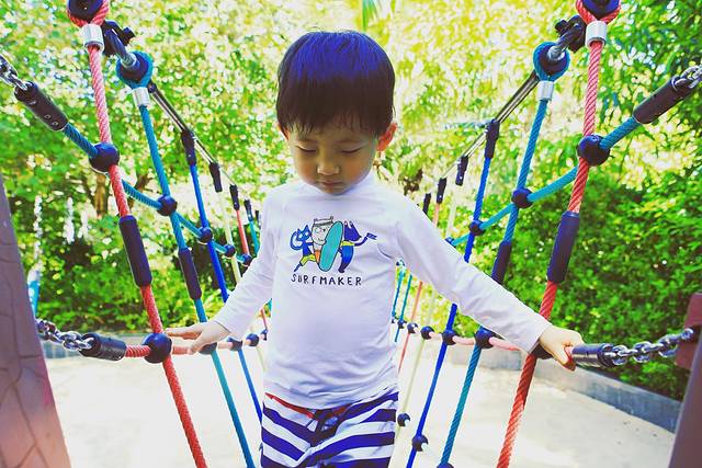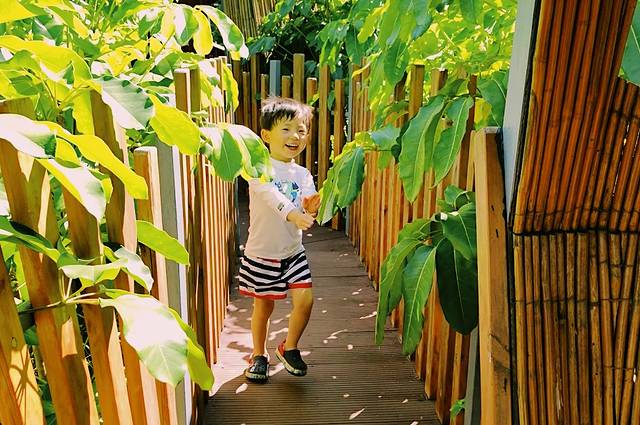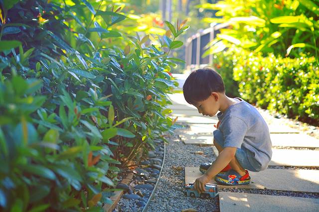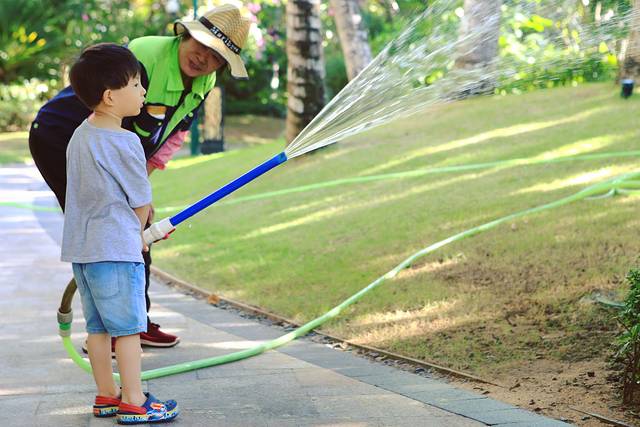 那个清晨,在酒店草地旁,阳光笼罩着拿胶皮管奋力浇花的瞧瞧,旁边一位笑意盈盈的园丁大姐,弯下腰同他讲话。我走过去示意很抱歉,大姐说没关系,所有小孩都喜欢浇花的。在君悦,孩子的好奇、父母的享乐、亲子的陪伴都被尊重,被成全。后来我发现酒店很多人都喜欢同孩子讲话,他们弯下腰,或者直接蹲下。
