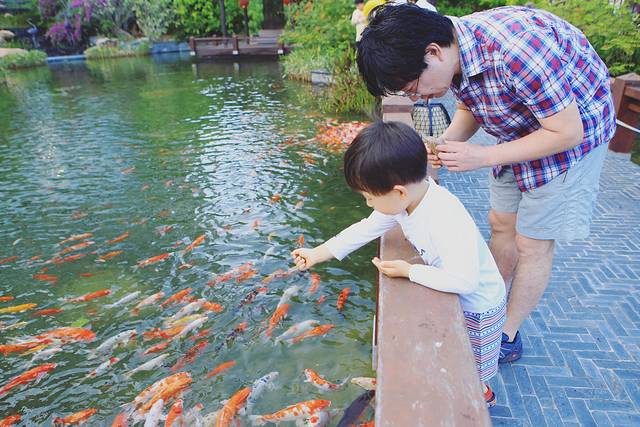 酒店的湖里有很多锦鲤,可以买鱼食投喂