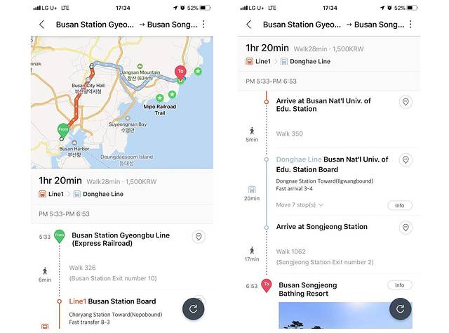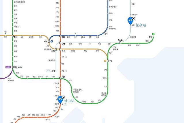 交通方式:地铁1号线釜山站出发,2号线“西面站”换乘东海线(浅蓝色),之后在松亭站下车。