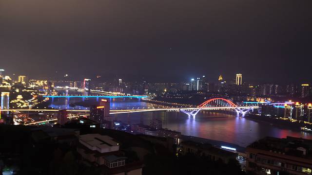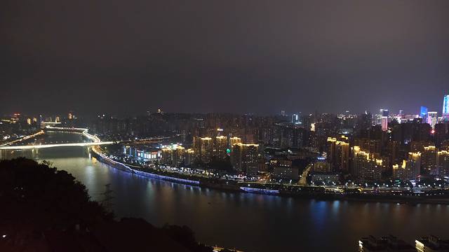 饱吃一顿,快8点了,立刻往鹅岭公园赶!走道鹅岭公园门口,有点像我们这边个别小区门口,雕刻石墙!进去后往右边走,爬一段比较陡的斜坡后就看到最佳观景楼——瞰胜楼(9层楼)!我们一鼓作气登上楼顶,哇塞!太美了,长江、嘉陵江好美啊! 重庆 的灯光夜景也太璀璨了吧!( Tips:楼顶风很大,要注意保暖)
