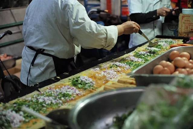 “酸甜辣,加根肠!”、“咸辣多加洋葱,不要香菜!”、“给我多刷点酱!”叽叽喳喳的声音能把人整蒙圈了,烤冷面大叔却早就心中有数,手上动作丝毫不乱,从容如一代武林宗师