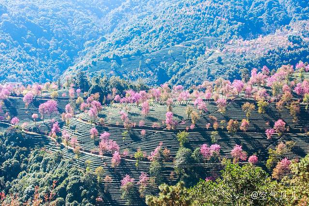 大理无量山樱花谷是春天最早到达的地方,淡淡的粉色弥漫在整个山谷间,在茶山衬托下显得浪漫至极。