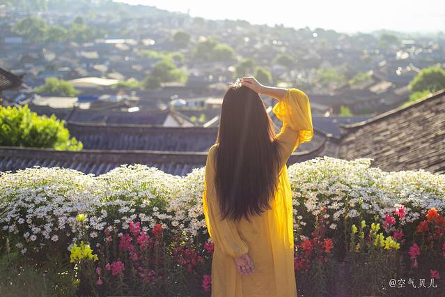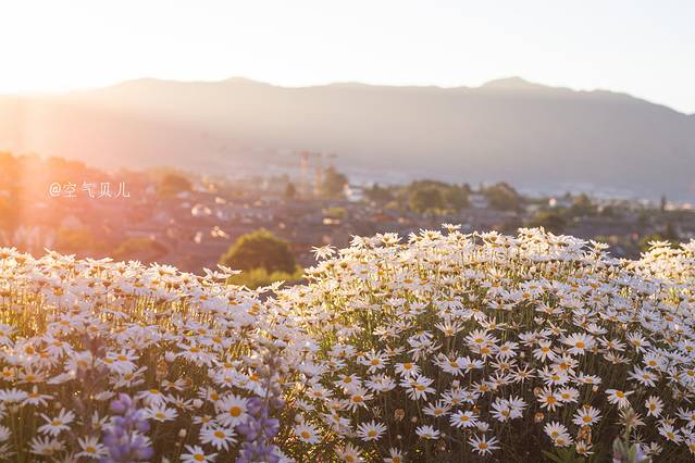听说在客栈就能看古城日出,特意早早起了床,晨光撒在花朵上真的是美爆了。