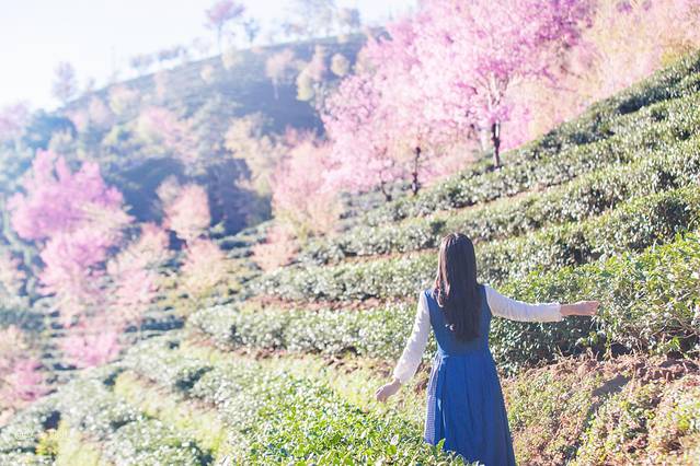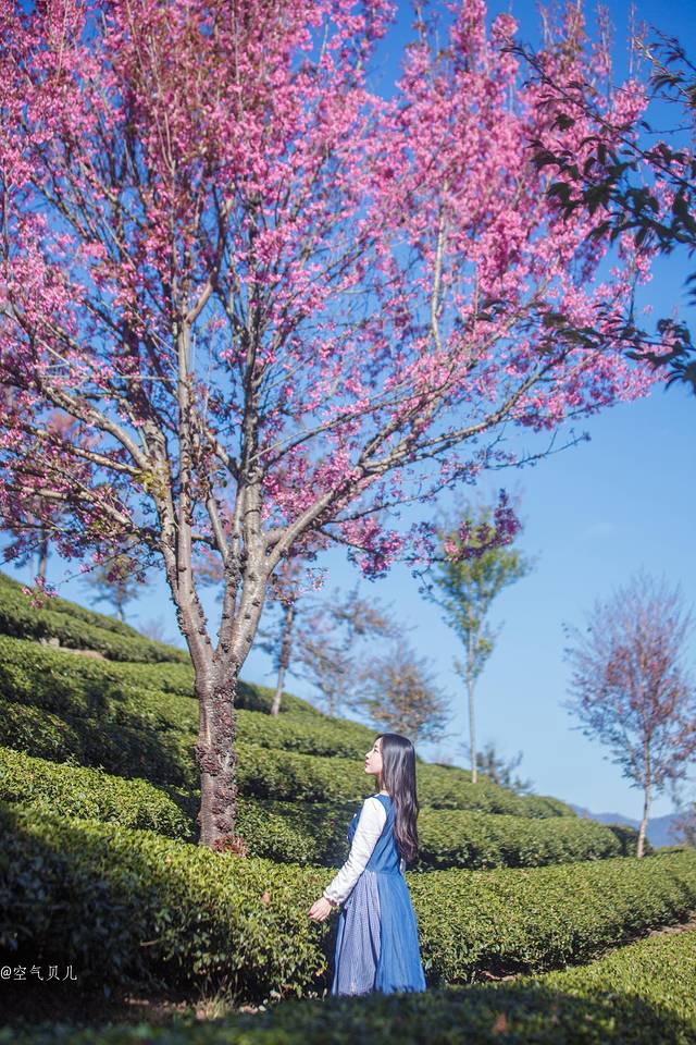 淡淡的粉色在茶山间显得清新而浪漫,清风拂面而来,心情豁然开朗。