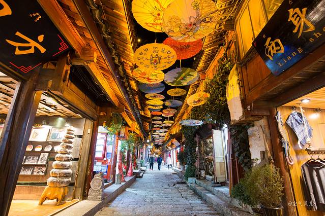 四方街旁边的一条巷子挂满了油纸伞,是抖音上很火的网红街,也只有在早上才能拍到游客很少的照片。