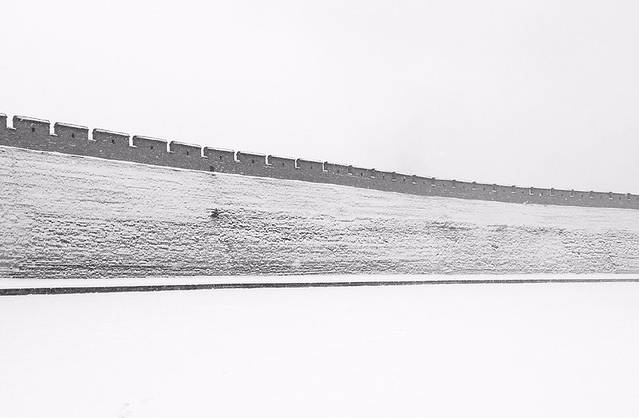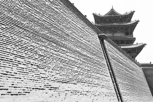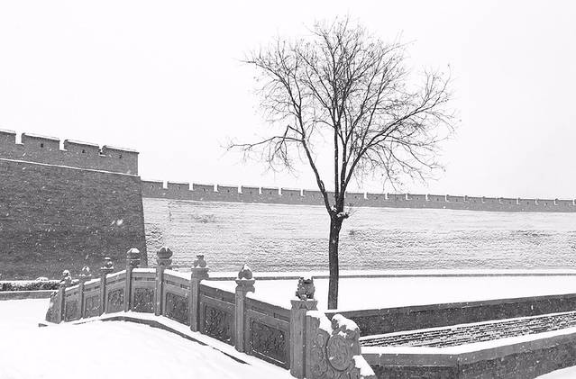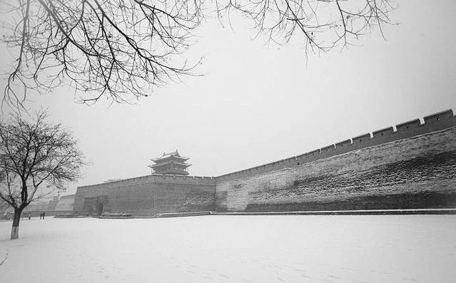 城墙在下雪的时候,每个砖缝都格外清新,就好像做了一幅平遥古城的画一样。