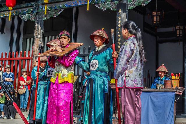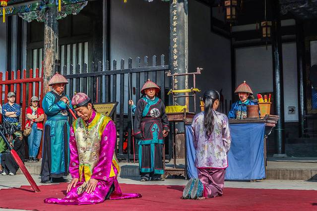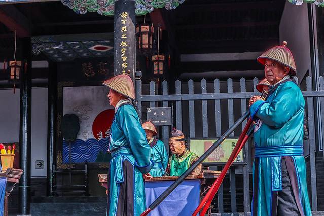 县太爷升堂的地方在大堂的前面,进到县衙穿过一进院便是升堂的地方,很多人在此等待现实版《铁齿铜牙纪晓岚》。升堂表演时间为:9:00、11:00、15:00,三个场次。