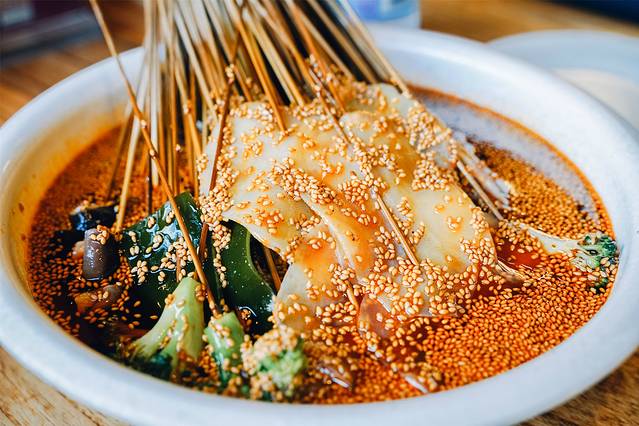 钵钵鸡有红油味和藤椒味,小A建议大家两种味道都不能错过。红油味钵钵鸡香麻感十足,表面铺满的一层芝麻更是提香不少。藤椒味钵钵鸡更偏麻辣的口感,藤椒的麻味和小米椒的辣味紧密融合在一起,给味蕾带来十足的刺激。