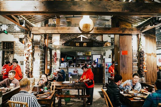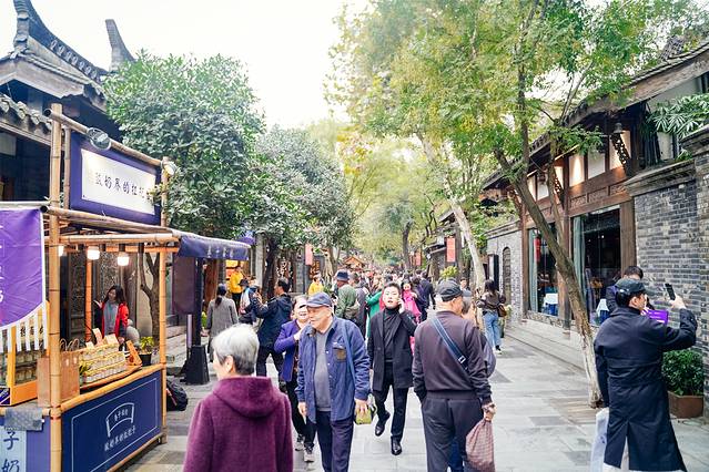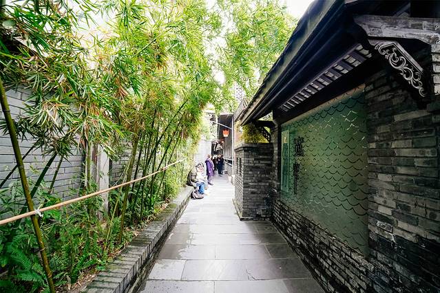 青黛砖瓦的仿古四合院落,宽巷子、窄巷子和井巷子平行排列组成。古香古色的气韵被完全保留。既像是一个独立的江南小镇,但是却又和成都的现代发展相互交融。