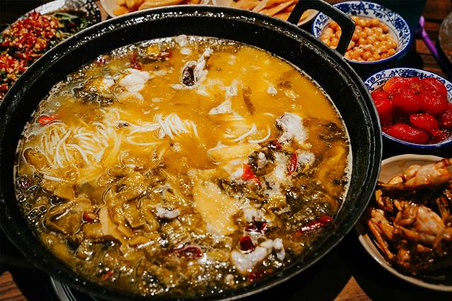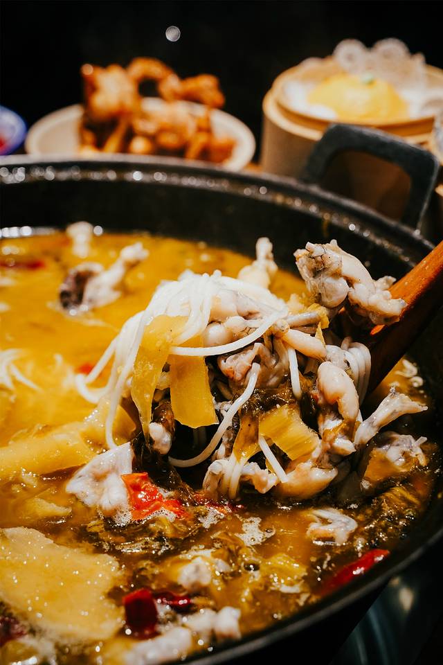 古法酸菜锅底,既有酸菜的酸咸开胃,又有泡椒和小米椒的麻辣开场。不管是烫什么食物,都让人赞不绝口!