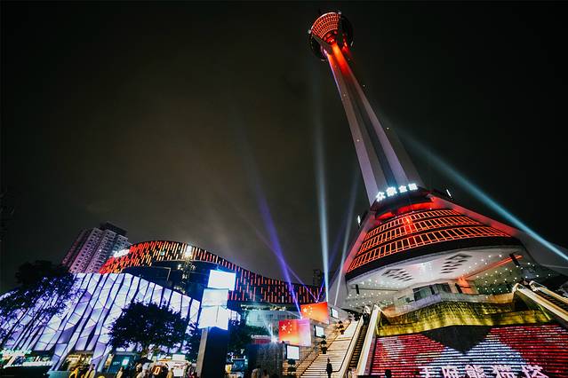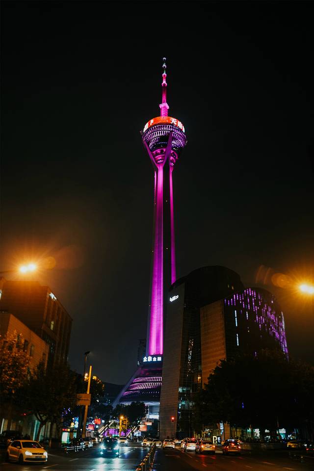 夜晚来临,电视塔及附近建筑的彩光灯相继开启,昏暗的夜色也成为了它的画布,灯红璀璨,耀眼夺人。