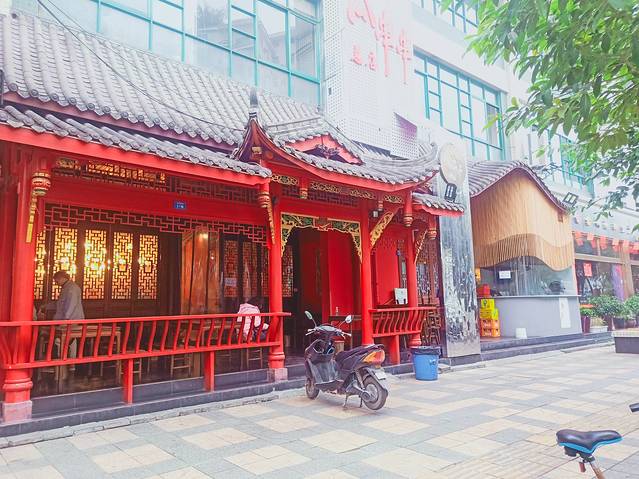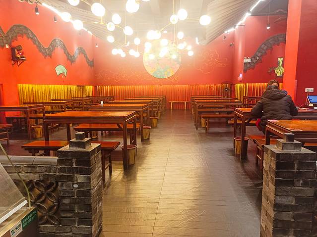 大堂外面还有许多座位,门口看着古色古香的,进门感觉环境很好,座位安排的很宽敞。我觉得顶上的吊灯很好看,造型很特别。
