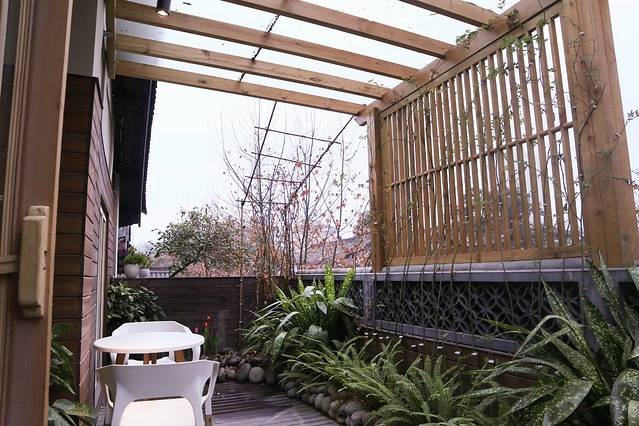 三楼的苍鹰房间内大大的观景阳台也是花园,个人比较喜欢在阳台上赏景、品茶,看看宽窄巷子人来人往,我自慢慢品茗,心情愉悦。