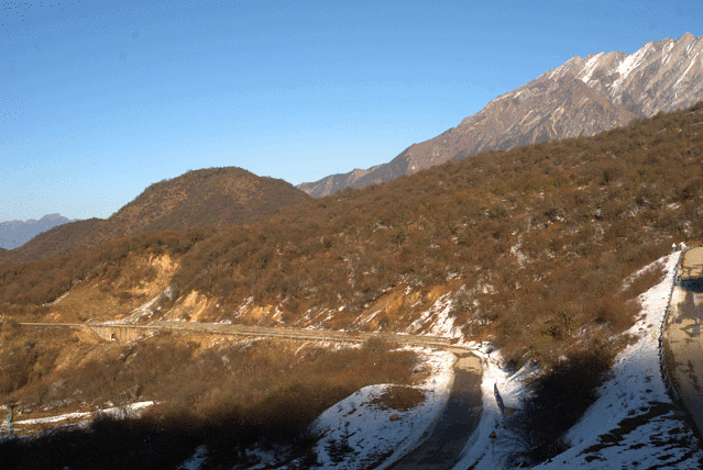随着海拔一点点升高,渐渐觉得温度降了下来,巴士在山岭之间盘旋而上,远处是山峦和蓝天,脚下是逶迤的公路。