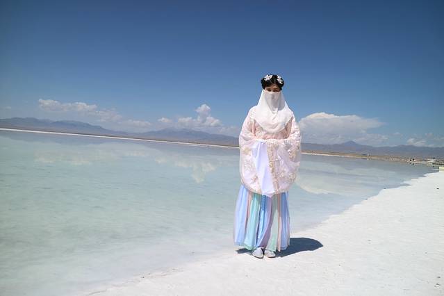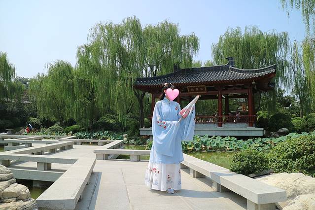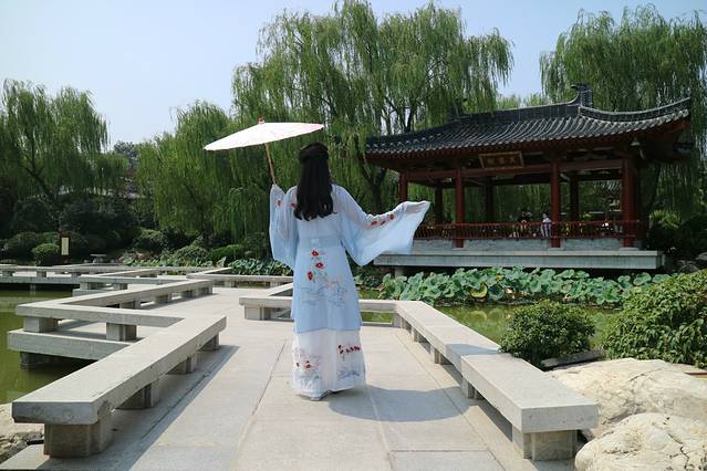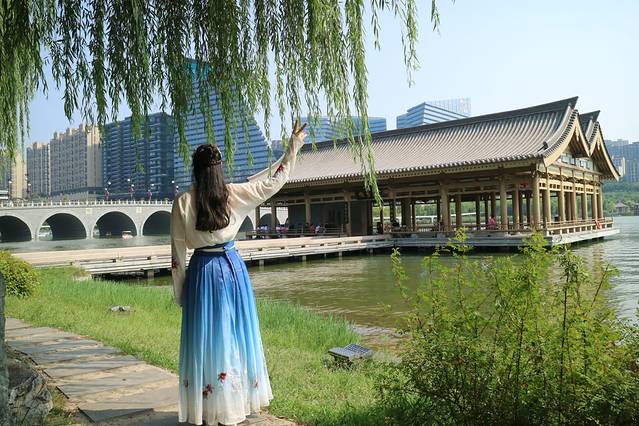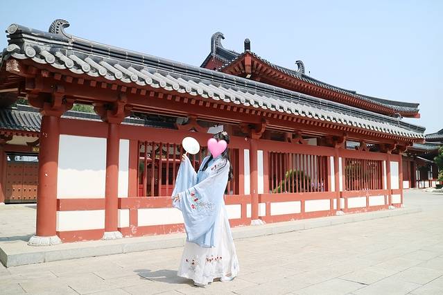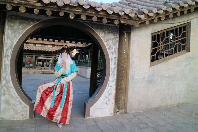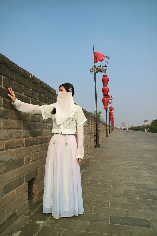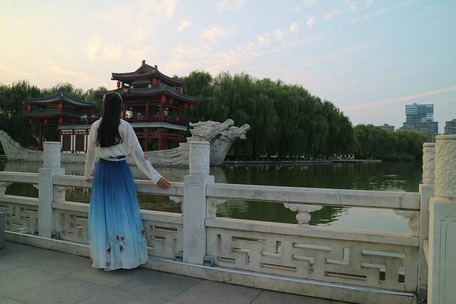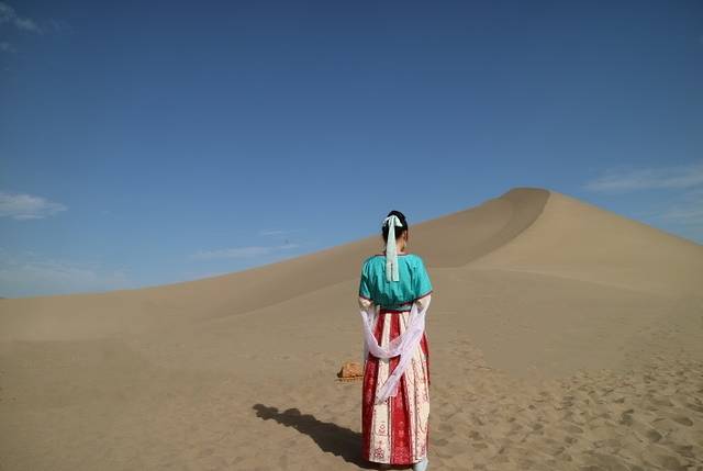 敦煌飞天是敦煌的名片,特意穿上坦领汉服,感受一下意境。