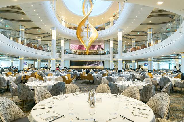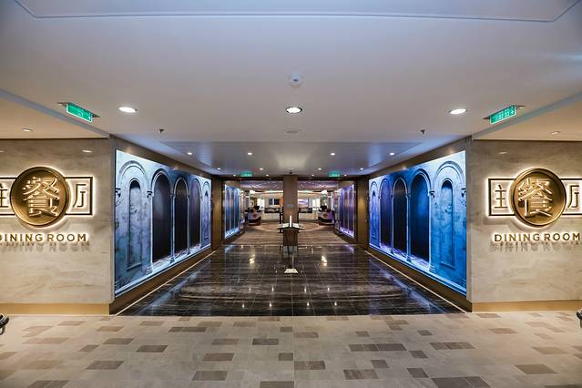主餐厅每餐同时提供中西不同的两种菜谱,供游客个人单点环球美食,亦或是全家共享。皇家加勒比海洋光谱号是国际化的游轮,船员来自世界各地,采用英语服务,西餐自然是他们的拿手绝活,品质自不在话下,而中餐做起来也绝对像模像样,出品很地道,连摆盘都精致的像件艺术品。
