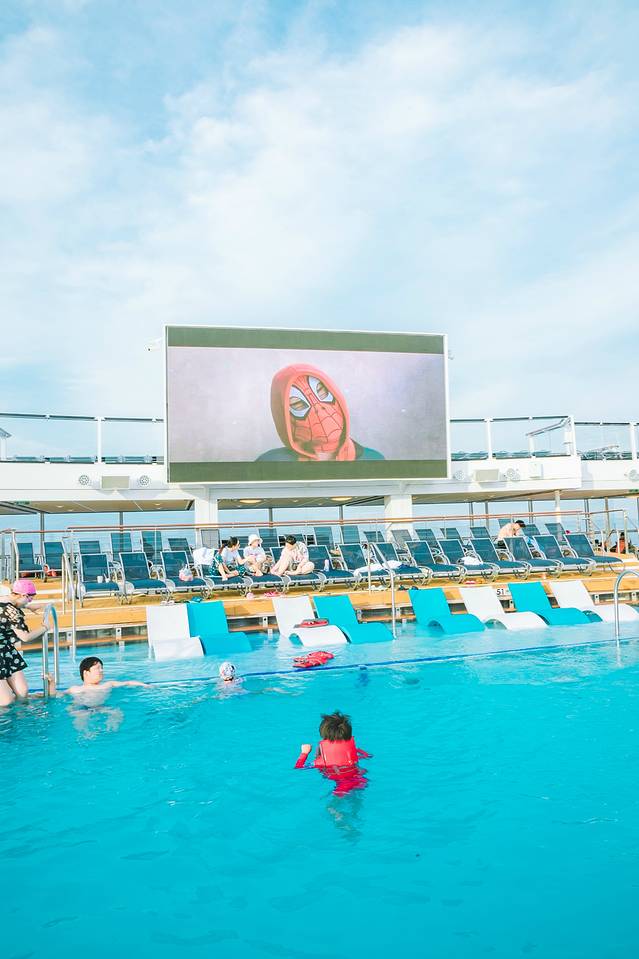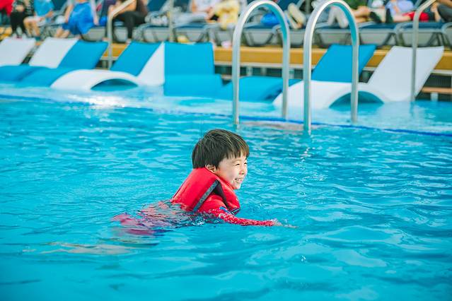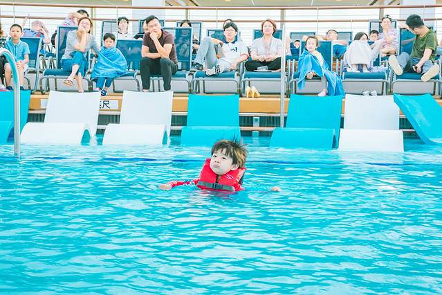最后一日的海上巡航,一一圆了小朋友的心愿,游泳池走起~船上提供各种size的救生衣,选了合适的号码船上,比自己带的游泳圈还要合适,这一次,即使没有我在身边陪伴,这位小朋友也勇敢的下了水,开心的游了起来,并且,越玩越上瘾,不愿意出来。。。。。