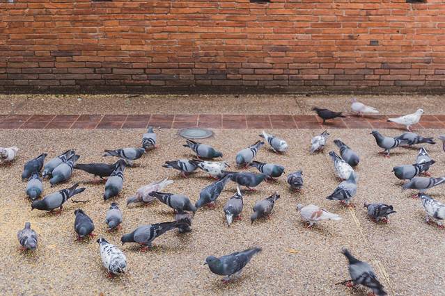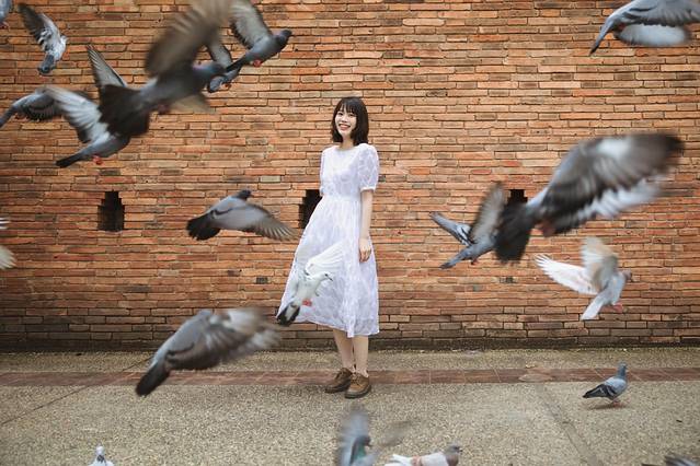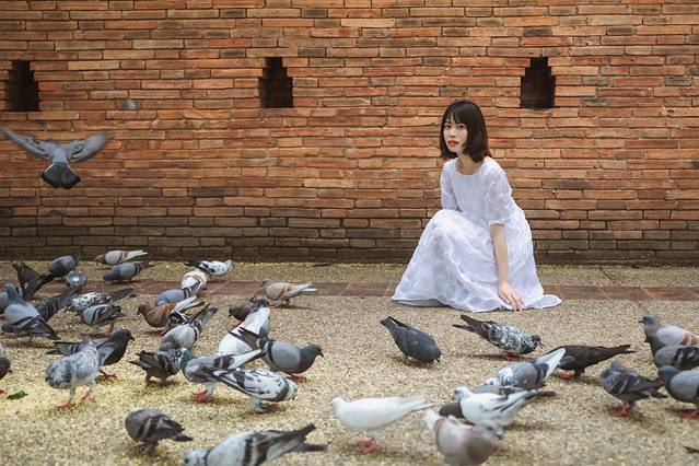 小心翼翼走入鸽子群中,才能拍到和它们同框。