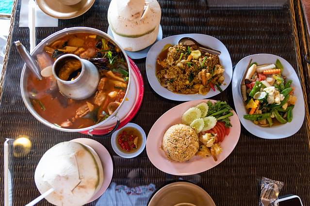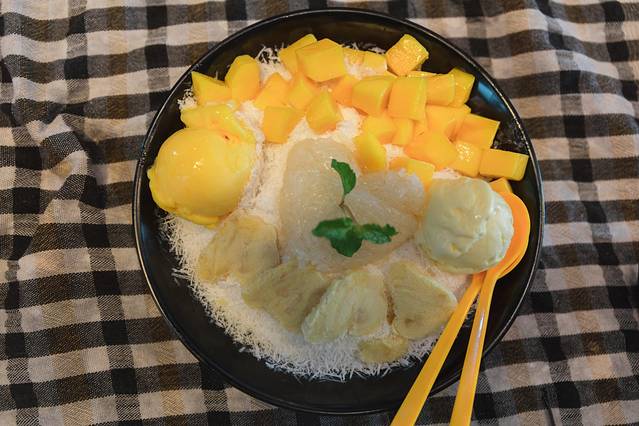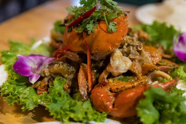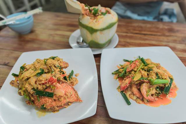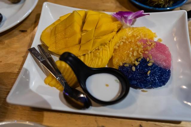 其实一开始的体验并不好,因为店面小,人又多,我们坐在外面的桌子。上了一个鸡肉和芒果饭后就一直不上菜,我以为是上菜慢,直到我看见里面比我们晚来的客人都上了,我们才叫了服务员反馈,然后5分钟我们的蟹和冬阴功汤就上齐了,我猜想因为我们坐在外面被遗忘了。后来老板过来和我们道歉了,还送了两个个他亲手做的小小的冰淇淋球,最后结账的时候也给我们打了8折做为补偿,一共1050泰铢。原本乔治想在大众点评上给个差评,但是因为及时的弥补和服务态度,我们没有给。