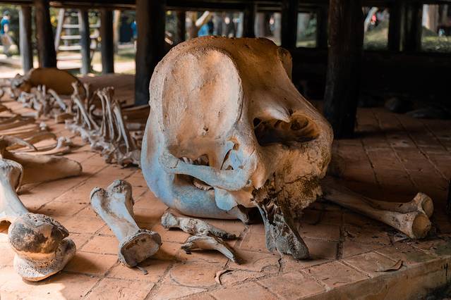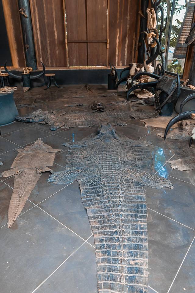 陈列的都是大型动物的尸骨,最多的是大象的头骨、鳄鱼的皮、牛的角等。
