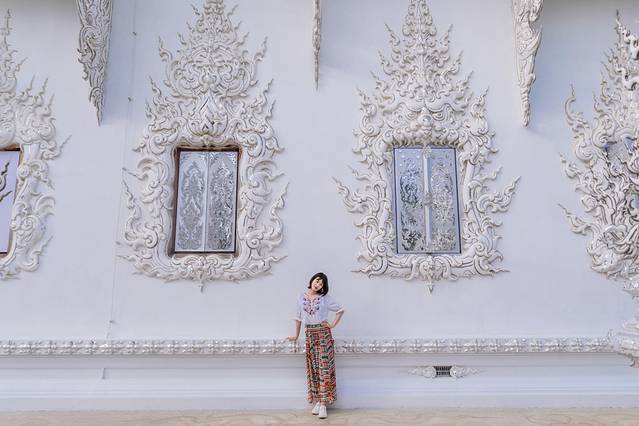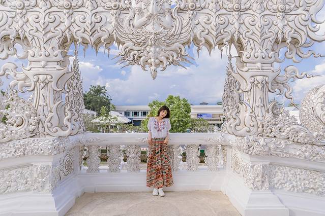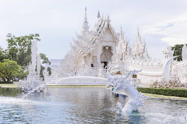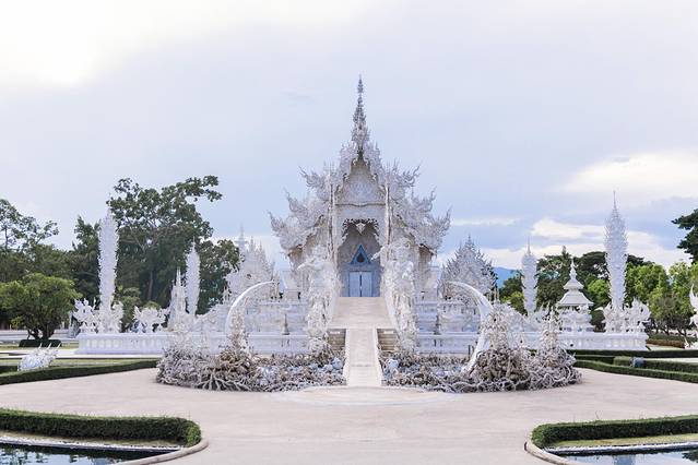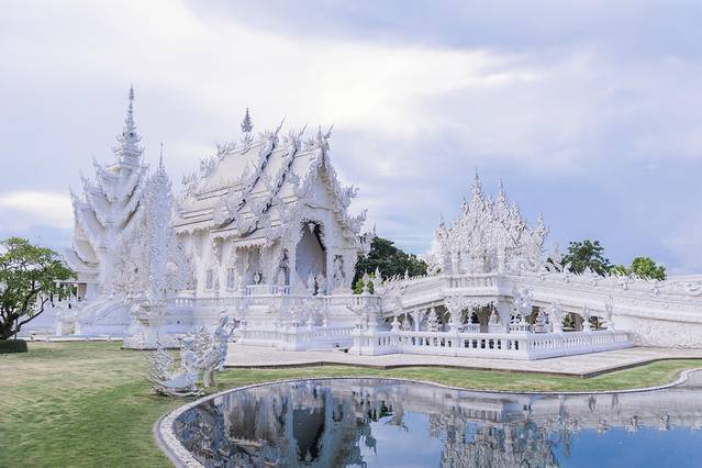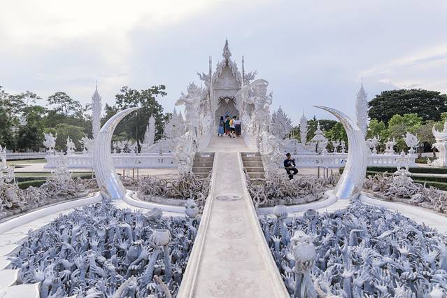 泰国的寺庙大多是金碧辉煌、金光闪闪的,而白庙却以它的纯白独树一帜, 别具特色,它是泰北寺庙届的一股清流。