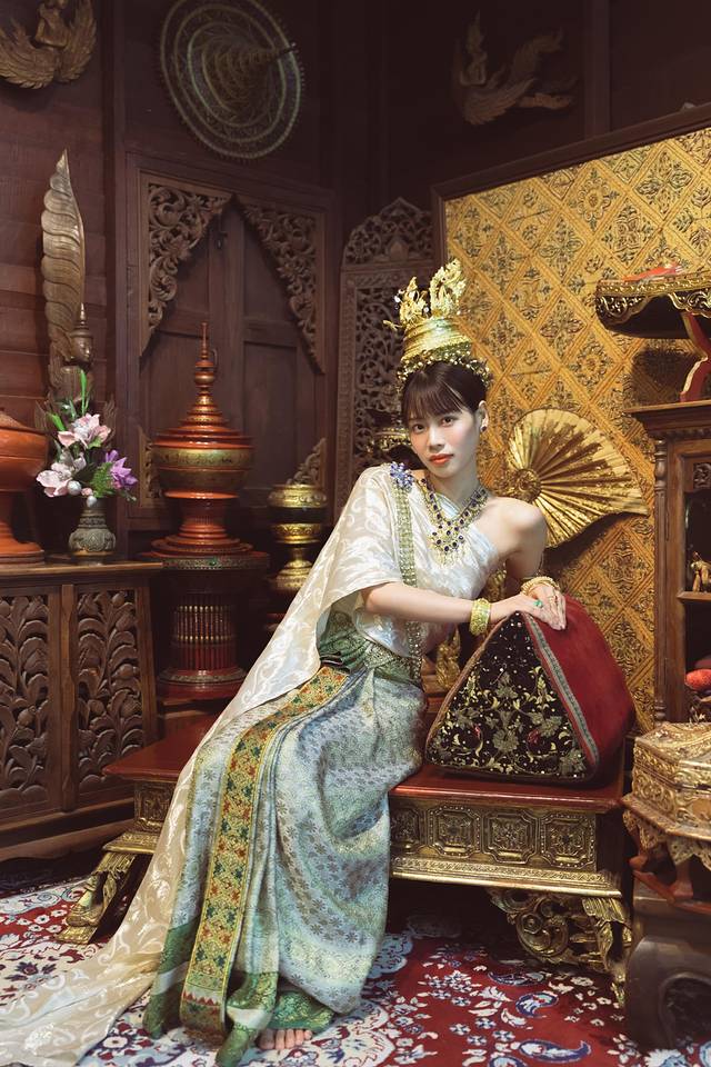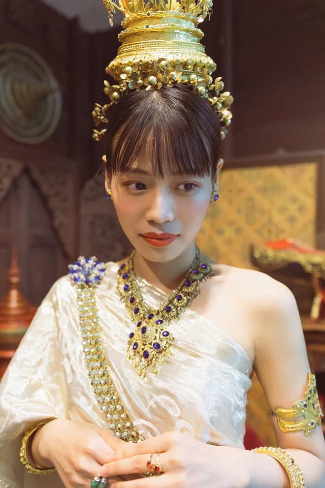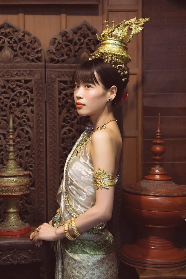 第1步:小姐姐帮忙穿泰服、盘头发、戴首饰、化妆,但是我拒绝了化妆,因为我本身就化了妆。第一次穿金戴银,超级富贵,体验了一回“泰国王妃”的装扮~