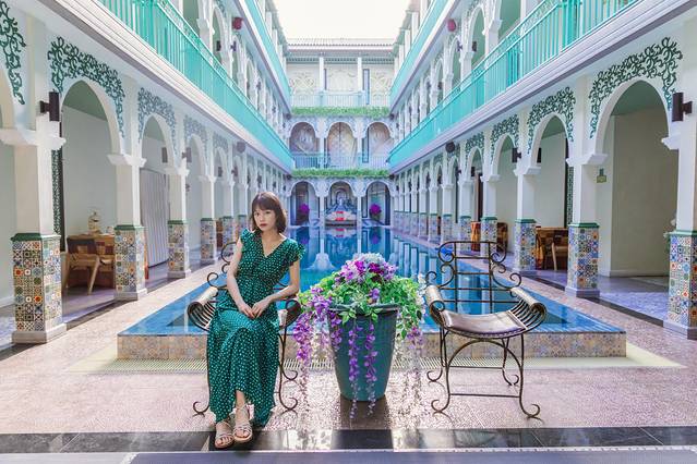 作为不是本店住客,酒店也允许游客来这里喝个下午茶,顺便拍拍照。酒店提供适合拍照的服装,但是因为我们是外来的,不好意思问服务人员要,幸好我自己搭配的衣服也很适合这里的配色。