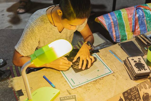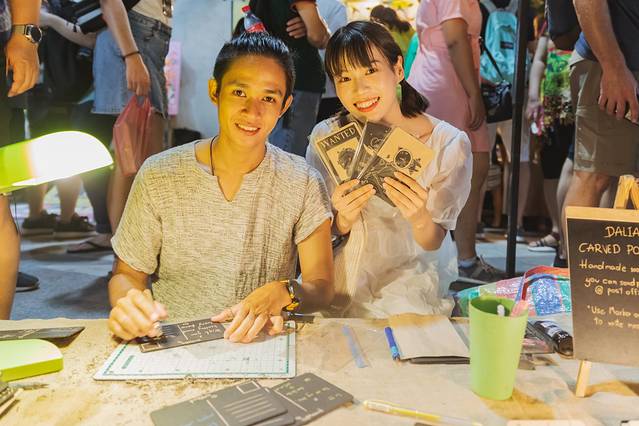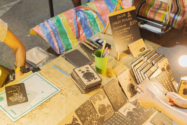最喜欢的其实是这位手艺人,他的明信片是他自己手工刻出来的图案。一开始没有人光顾他,直到我坐下开始挑选他的明信片,越来越多的游客都来买了。