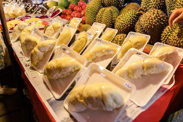 (有个店家告诉我,整个市场都没有真正的猫山王,说有的店都是骗人的,猫山王卖的更贵;如果不要干燥剂的会更划算,实际榴莲干重量更多,但是不好保存;块状的更划算,但是小粒的更方便吃;其实榴莲干太黏牙了我觉得口味一般)