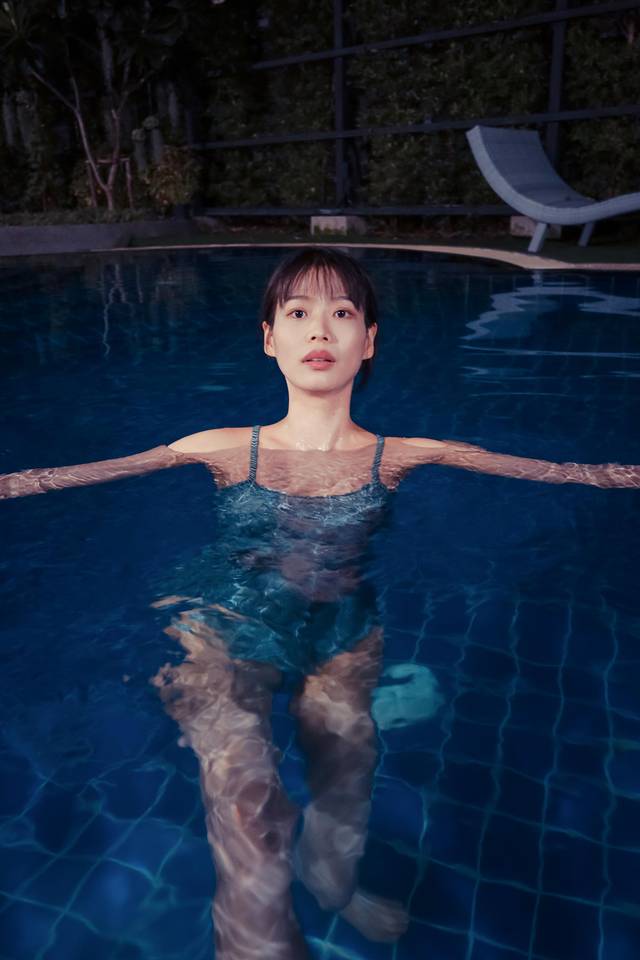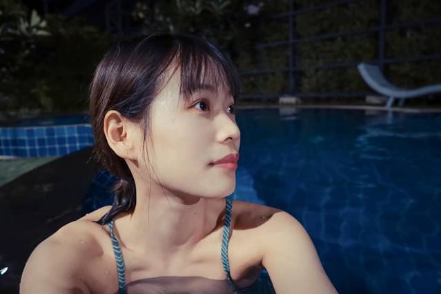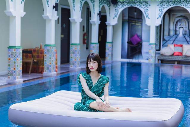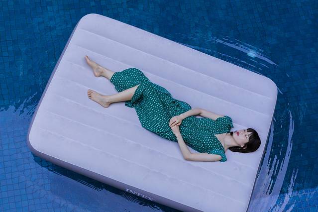 酒店提供一个漂浮气垫,小心翼翼地爬上气垫,漂在泳池里。