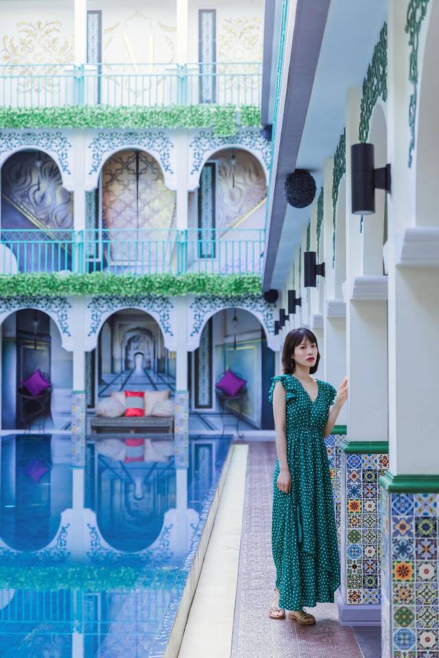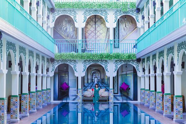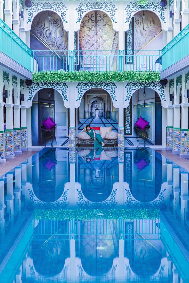 泳池周边摆放着异域风情的沙发,没去摩洛哥前就在这里过过瘾吧。