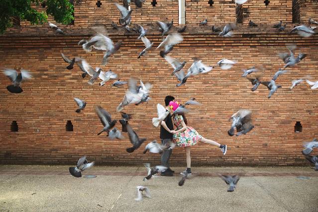 鸽子被惊吓起飞,我前一秒还是被它们吓到的惊恐表情,后一秒立马管理好自己的面部表情,保持微笑,抓拍到了这一张照片。