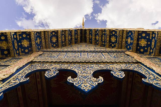 蓝庙的蓝色很深邃,但是又不厚重;饱和度很高,但是又不浓郁。因为蓝庙不是纯色的,顶上有闪闪发光的金箔,把整体的饱和度压了下来。外观的木质雕刻精美繁复,门前两飞条的龙鳞也是五彩绚烂。