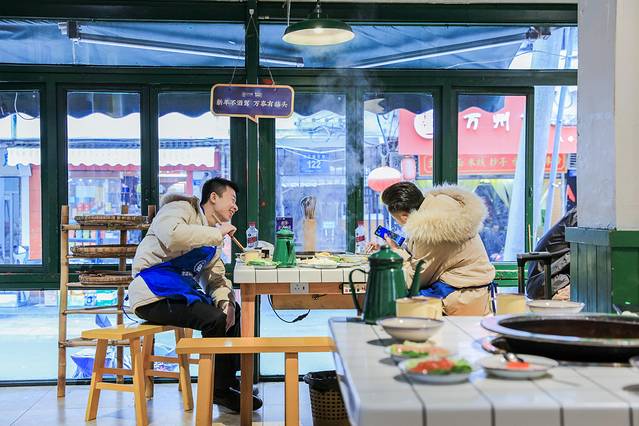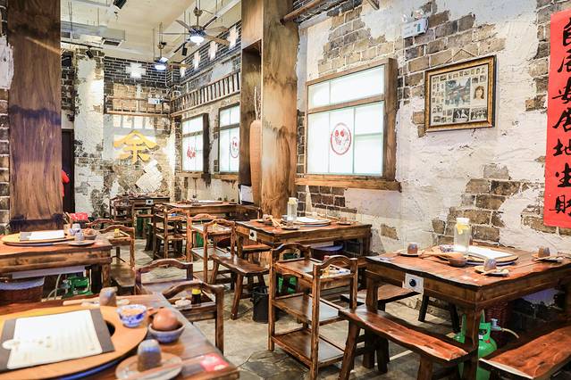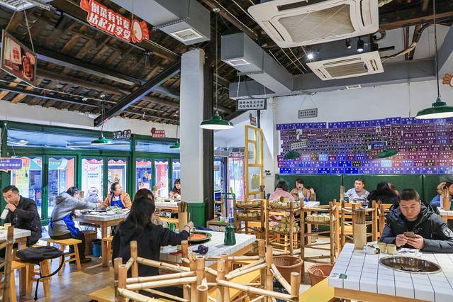 记忆里的色彩在这里得到延续,邮政绿复古得让我回想起小时候寄出去的第一封信。筲箕竹架,搪瓷碗、搪瓷壶、老海报、黑白电视,与时代对峙却不显寥落,这是人来人往的生活气息,是走街串巷里,糖油果子的酥炸声,铁环滚动的叮当响,黑白电视的影片集,噼里啪啦的搓麻将,悠闲舒适的盖碗茶,串门嬉戏的笑语声,还有围炉捞欢的火锅飨。
