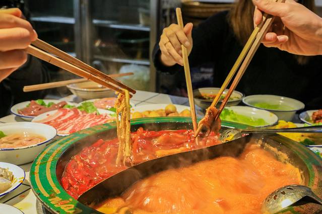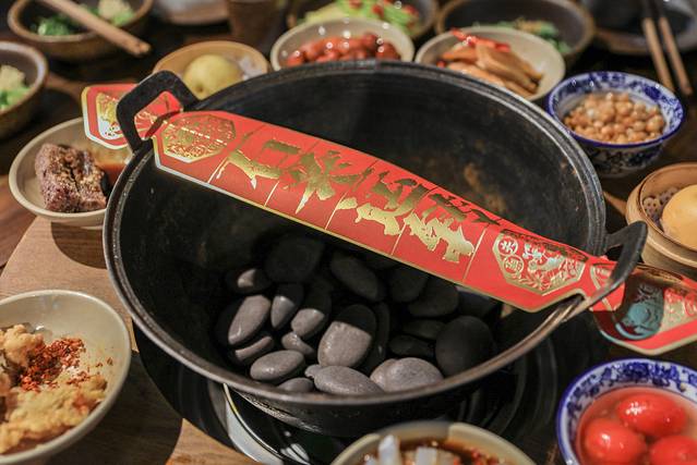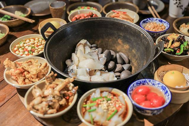 装着鹅卵石的铁锅端在桌上,比一般的火锅多了一丝盎然趣味。300°的鹅卵石和鱼肉亲密接触,之前面生也成熟人了。经典的红锅咕噜咕噜冒着泡儿,欢迎着与鱼的友好会面。这将是命中注定的佳话,是有刁钻口味的 成都 人才有的绝妙想法:火锅,与鱼可以兼得也。