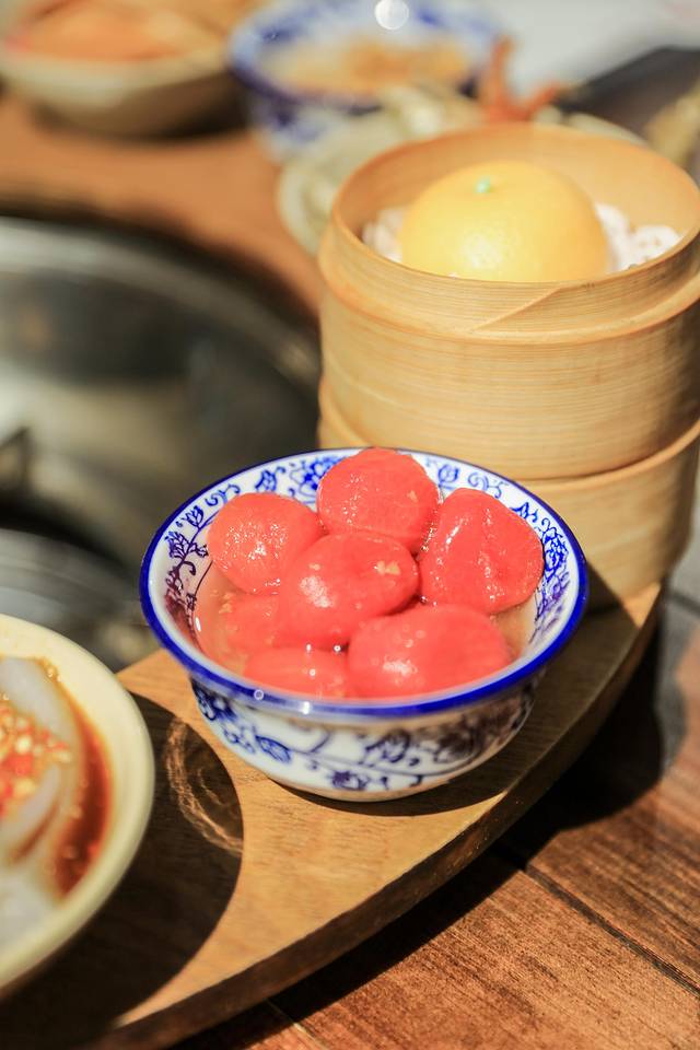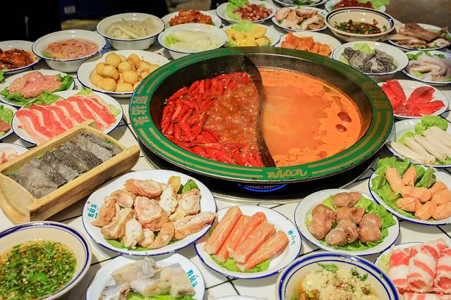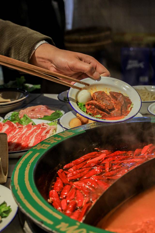 把毛肚、牛肉、虾饺、鱼丸、玉米肠、肥牛、无骨凤爪、午餐肉豪气地铺满整个桌面,依次排队下锅。辣椒是红锅的灵魂,看着都写满了赏心悦目。