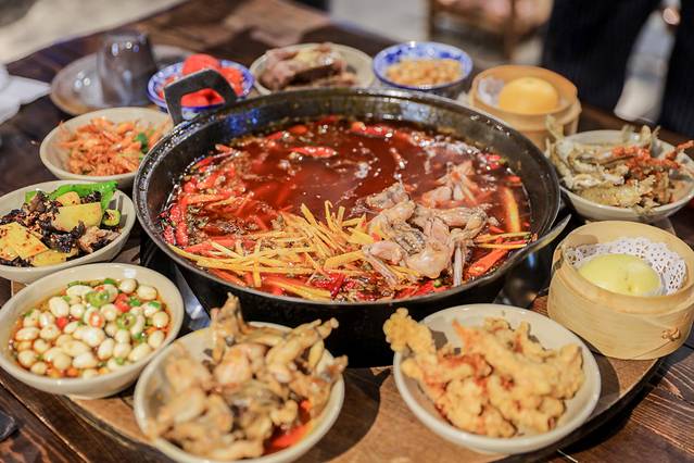 除了鱼,这里还可以吃到美蛙,用红锅汤底配美蛙,可以盖住腥味,蛙肉紧致Q弹,而且肉质很饱满。还有锅旁一圈小吃一定也要点,可以转起来,想吃那份转哪份。