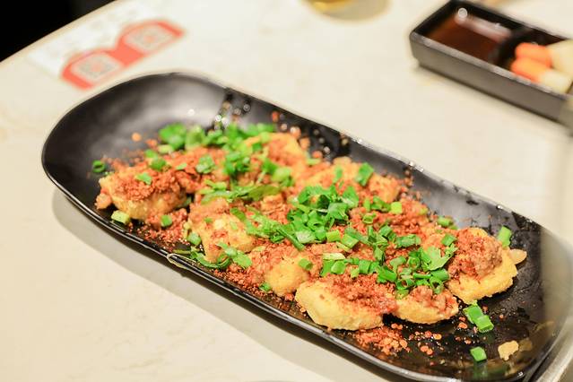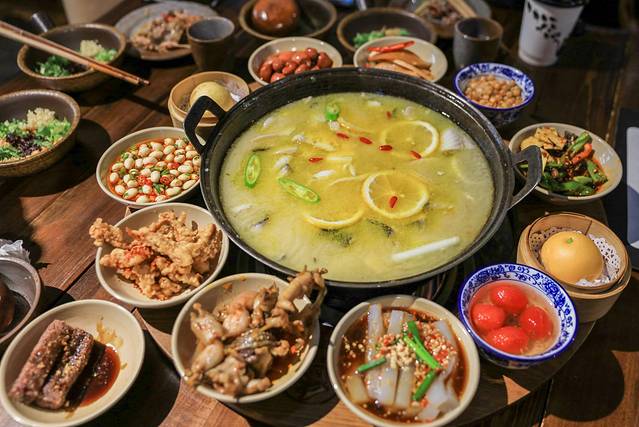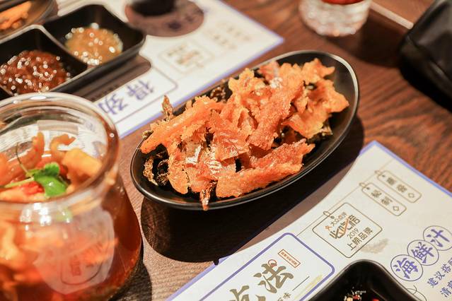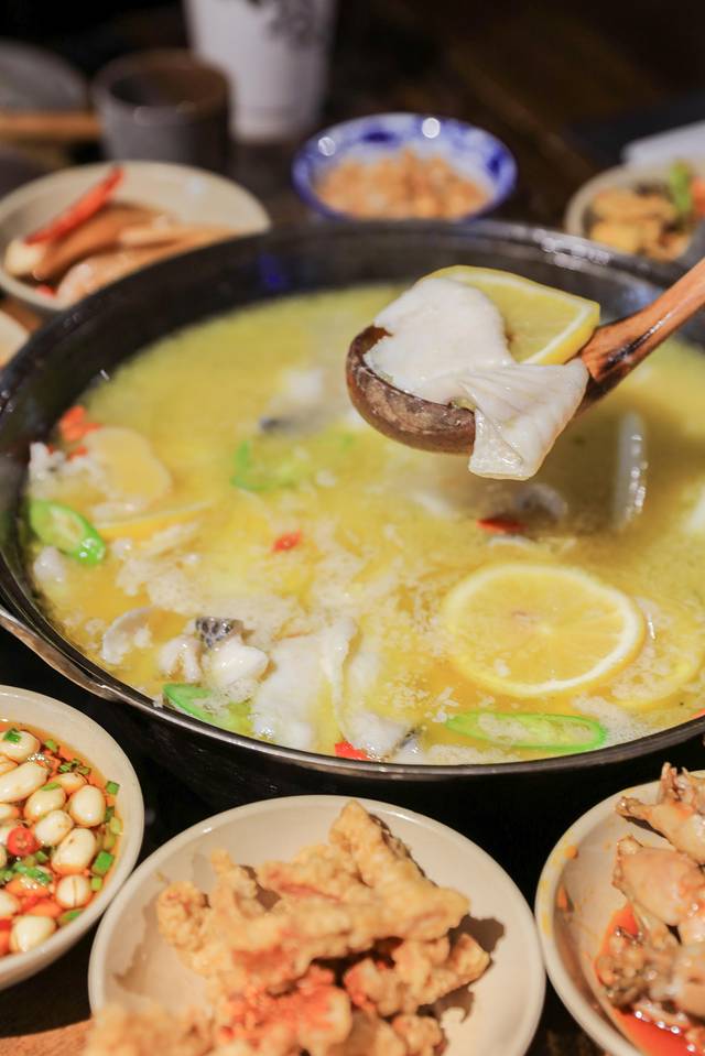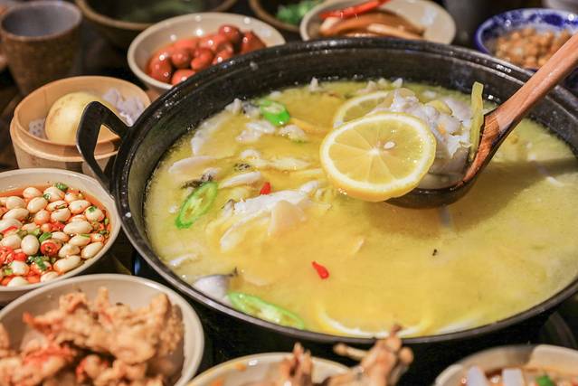 如果吃不太来辣,那么柠檬仔姜锅会给你宽慰。一勺上来,江团鱼肉就像豆花一样吹弹可破,镶嵌在两三片柠檬旁边。实在是鲜!小酥肉也是现炸,端上来都刚出锅热腾腾的,这个时候吃最鲜最香。外壳酥脆内里多汁,吃了一口还想一口。