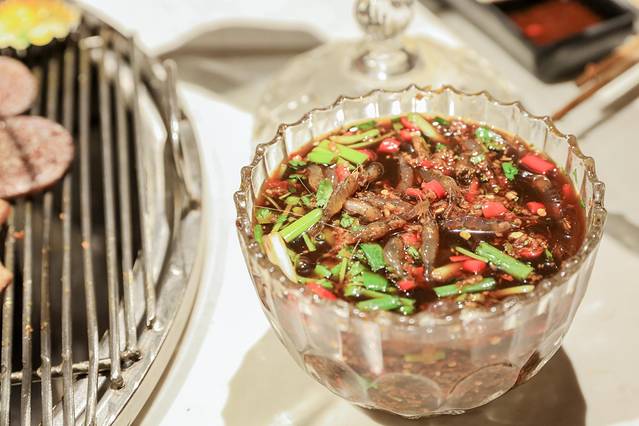 干碟和蘸碟味道都很有特色,给烤串增添了一抹色泽。大虾、羊腿、鸡爪,绝顶食材的碰撞,让唇舌都黯然失色,胃也发出餍足的喟叹。
