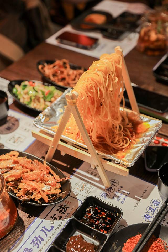 无论是墙面上世纪初的小卖部写照,还是桌上红白、蓝白渐变的碗碟,都把人从现代都市的繁华迷离中拉回到记忆里的最深处,那条少年时代常走过的街。拿一个杯子把不安分的竹签签儿都集合在一起,竹编的筲箕把它们从冰柜的梦乡叫醒,运送到一桌桌人们的身边。
