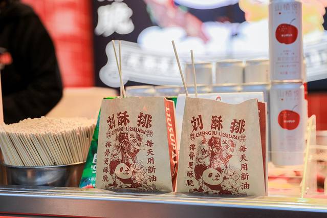 店面背景和褐色纸袋的熊猫,我与它两眼相看也甚是欢喜。欢喜之中,排到了最前面,却一下犹豫了起来:招牌香酥排骨和川香巴适酥肉,该选哪个好呢?