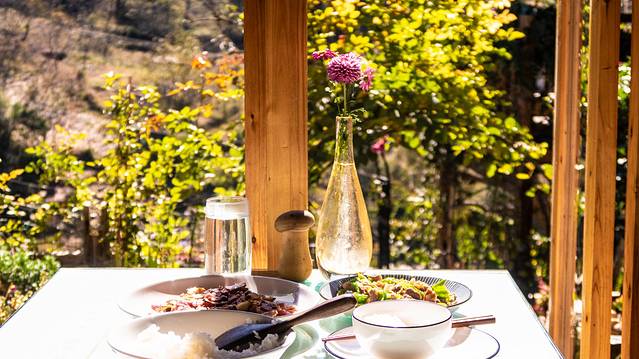 在客栈里,就着四溢的阳光吃饭,也是一种享受。窗外秀色可餐,盘中肆意飘香,万物静默如谜,有那么一刻,真想让时光就此停驻...