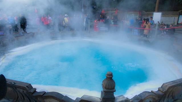 热海景区有大大小小几十眼温泉,在热海中,最壮观的要属“大滚锅”,它形如八卦,水温最高可达97℃,单是走近便能感受到足底已经发烫。池内碧水急剧翻动,跃出水面尺许,形成硕大水花。